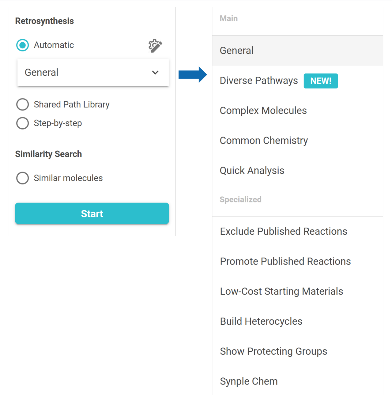 Use for: finding diverse and efficient pathways for most small and mid-sized molecules, a good place to start. - Diverse Pathways