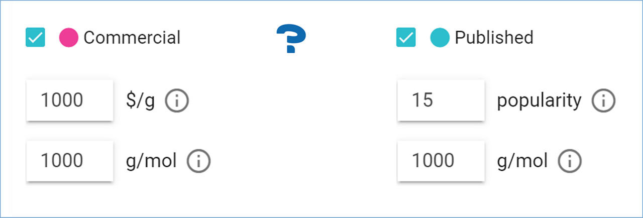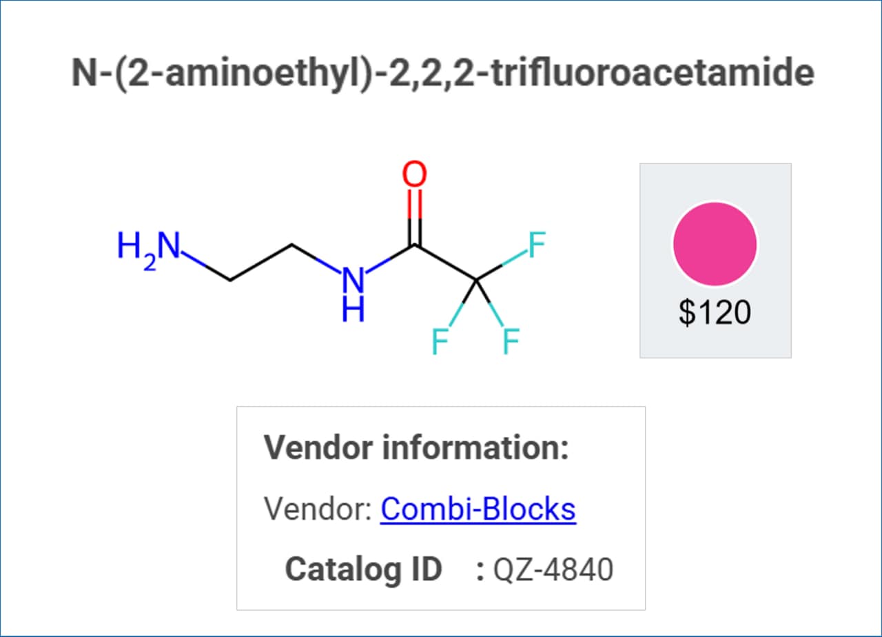 The Commercial compounds database includes compounds available from our Sigma-Aldrich Core catalog, as well as from our Building Blocks Explorer and Aldrich Market Select portfolios. Together, these resources contain over 8 million commercially available compounds from around 80 different vendors, all with price information.