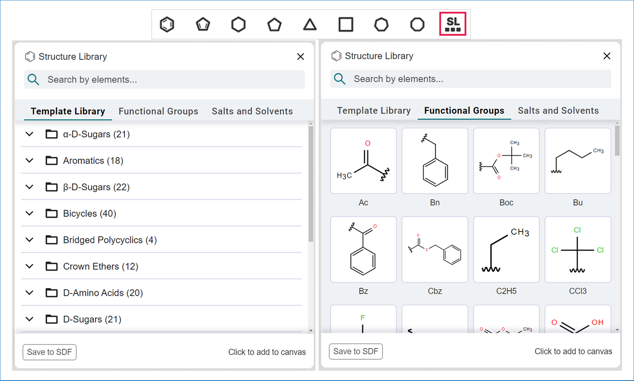 - Structure Library: Use the Structure Library icon on the right side of the bottom bar to access: