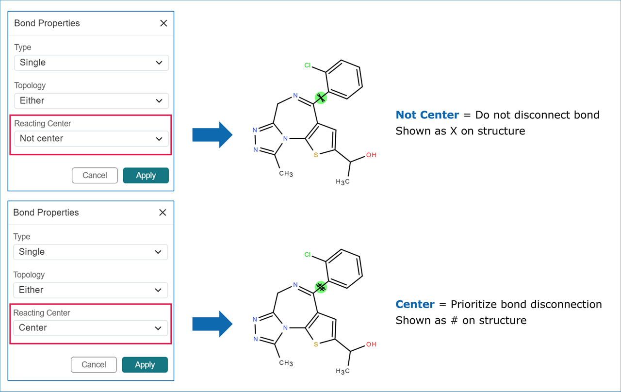 - Avoid Pathways: Select Not Center in the Reacting Center dropdown to prevent SYNTHIA™ from proposing pathways forming the selected bond. The bond will be marked with an X.