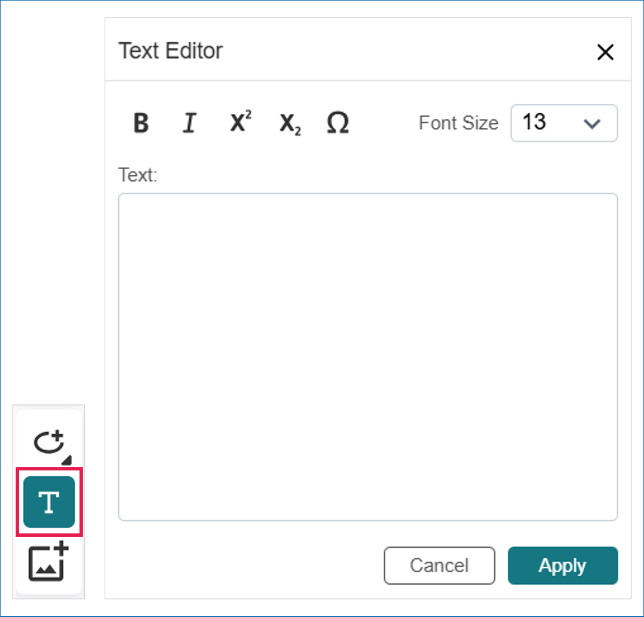 To insert text into the molecule editor, click the T icon located in the left-side column. Next, click anywhere within the editor to open the text editor popup.
