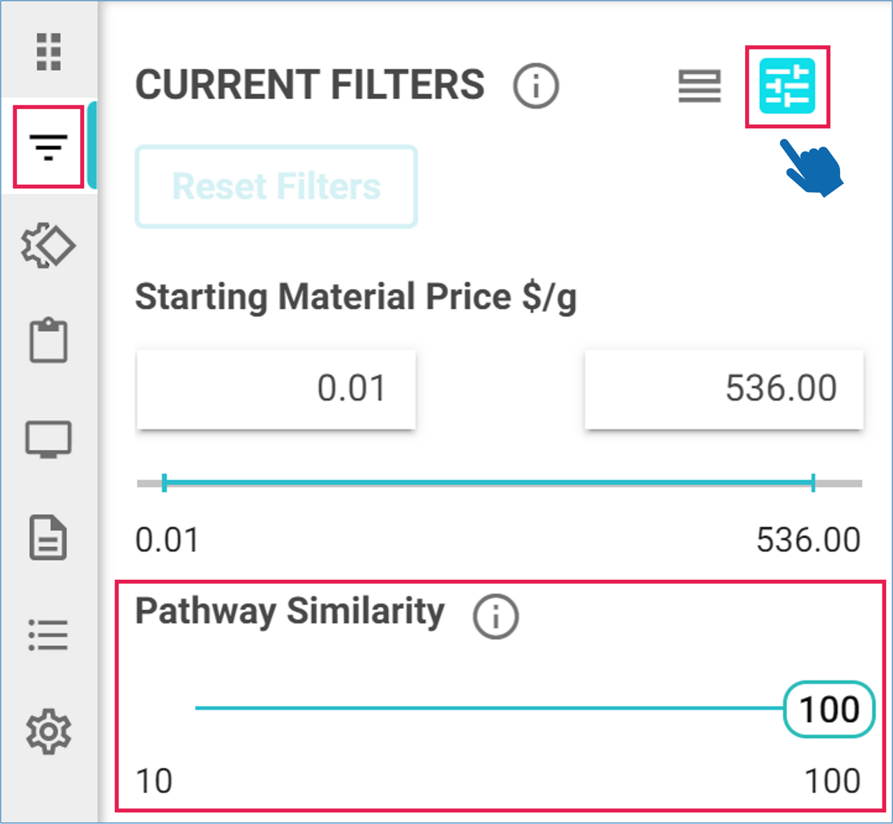 By default, SYNTHIA™ returns the top 50 pathways for every analysis. Because it can be overwhelming to sift through all this information, we have some post-search filtering options to easily pare down the full results set to a more manageable number of pathways.