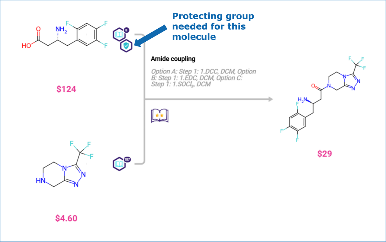 When reviewing your results, keep an eye out for a Shield tag next to a molecule. This indicates that a protecting group is needed at that step.