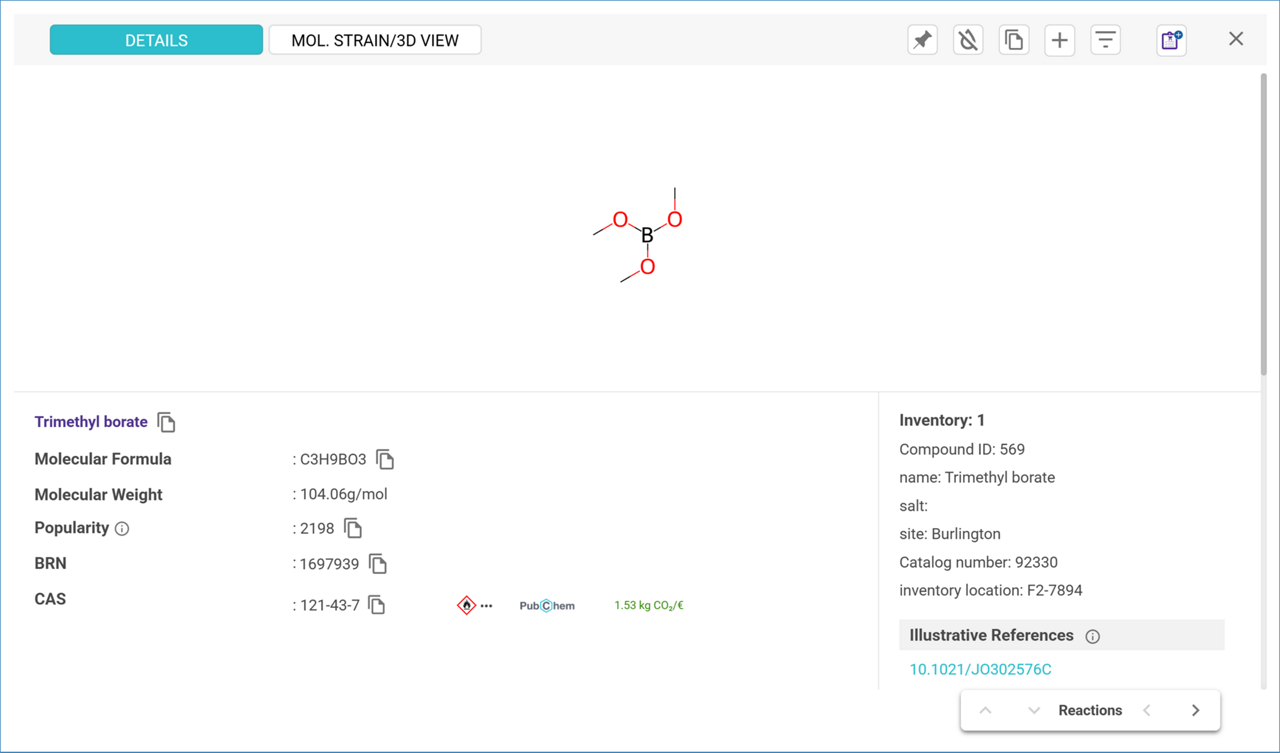 Compounds from a custom inventory display a Chemistry Glassware Set tag next to them. Compounds that also belong to one of our published compound databases will display a Book tag and their popularity score badge, meaning the number of times the compound has been included in a published reaction.