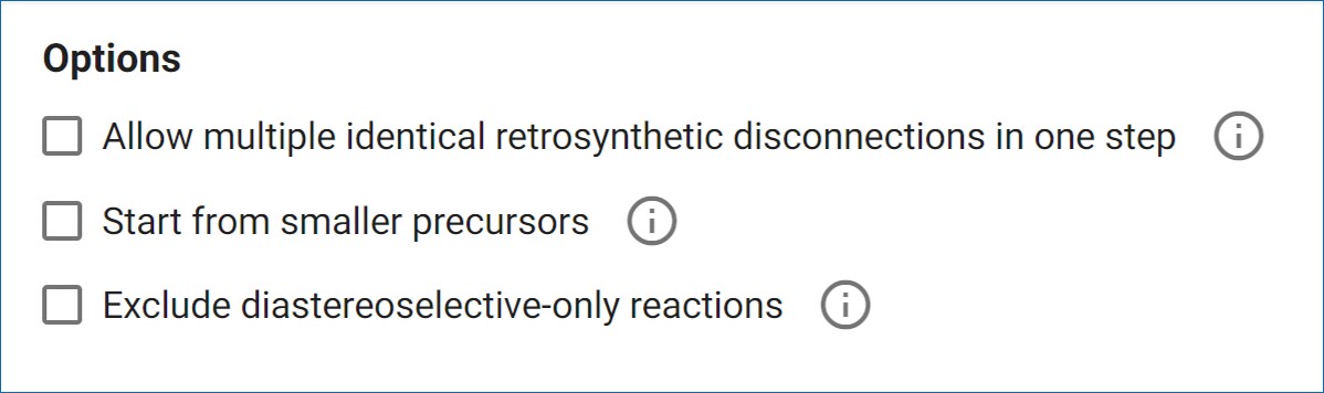Tip: The ‘Allow multiple identical retrosynthetic disconnections in one step’ option can be used for global deprotection of a molecule if multiple protecting groups are required, for example in sugar chemistry.