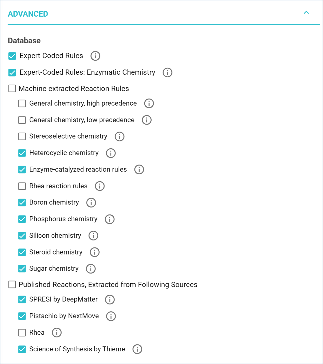 By default, all expert-coded rules are enabled, along with the machine-extracted rules for Heterocyclic Chemistry, Enzyme-catalyzed Reaction Rules, Boron Chemistry, Phosphorous Chemistry, Silicon Chemistry, Steroid Chemistry, Sugar Chemistry, and the SPRESI, Pistachio, and Science of Synthesis databases.