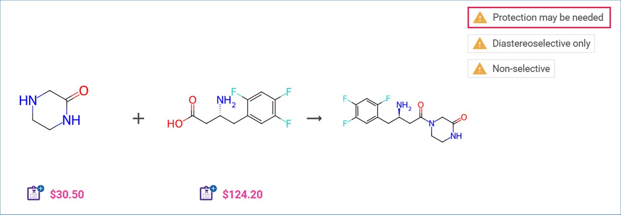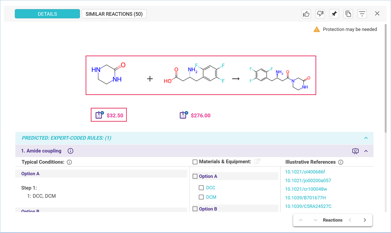 If a reaction has protection requirements, lacks selectivity, or is only diastereoselective, a warning icon will appear in the upper right corner of the reaction scheme, along with a corresponding indication.