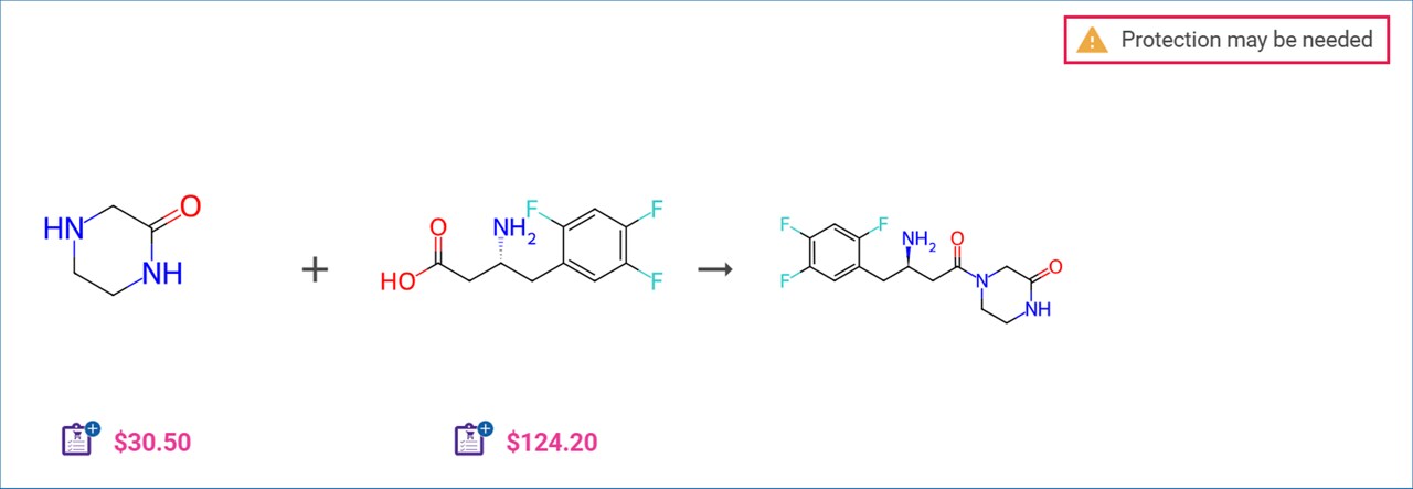 For predicted reactions, an alert icon may appear in the reaction scheme to indicate that a functional group requires protection.