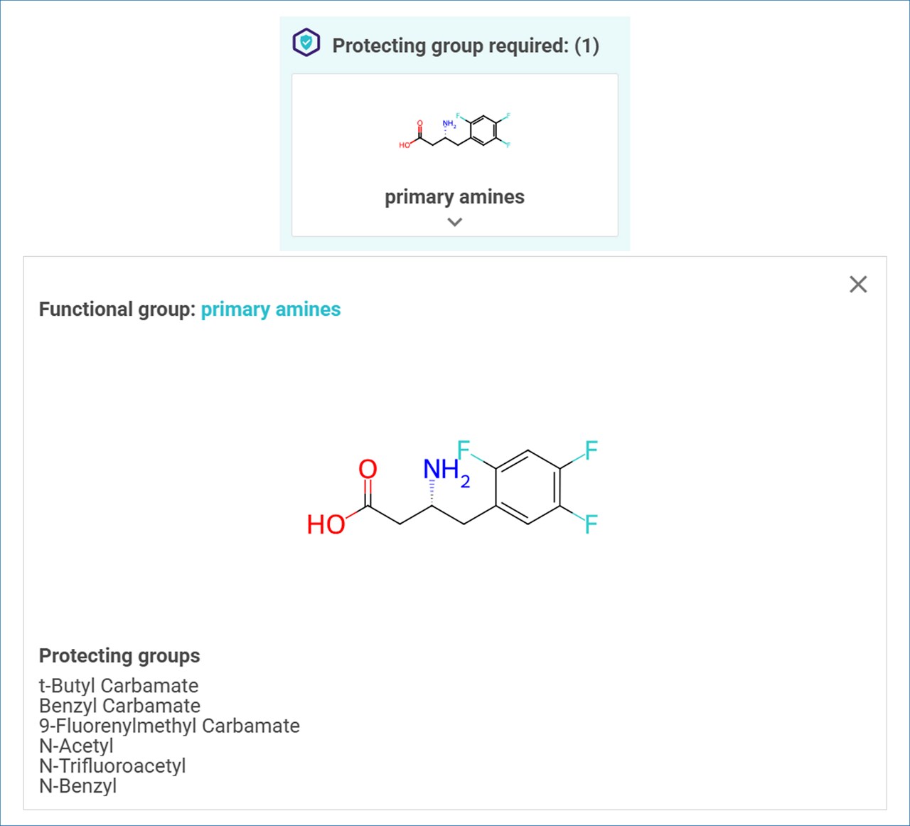 Note: The list of compatible protecting groups provided by SYNTHIA™ is not exhaustive. While SYNTHIA™ suggests a few options, there may be other suitable protecting groups that are not listed.