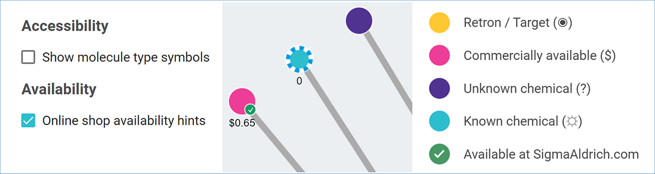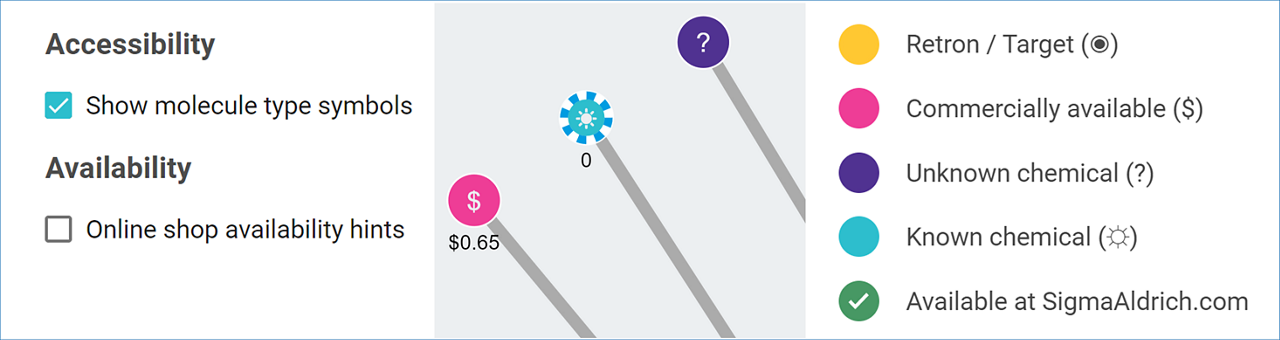 Molecule nodes available through sigmaaldrich.com are marked with a green tick.
