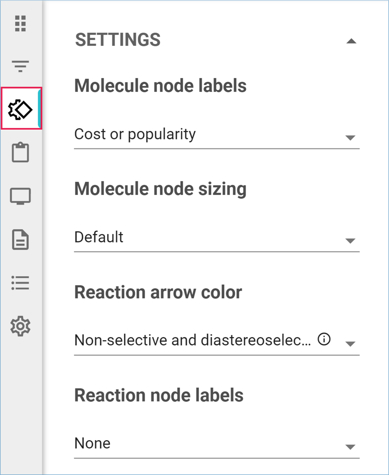 In the Settings panel, you can add diverse labels to molecule and reaction nodes, resize molecule nodes according to the value of one of their properties, or color reaction nodes and arrows.