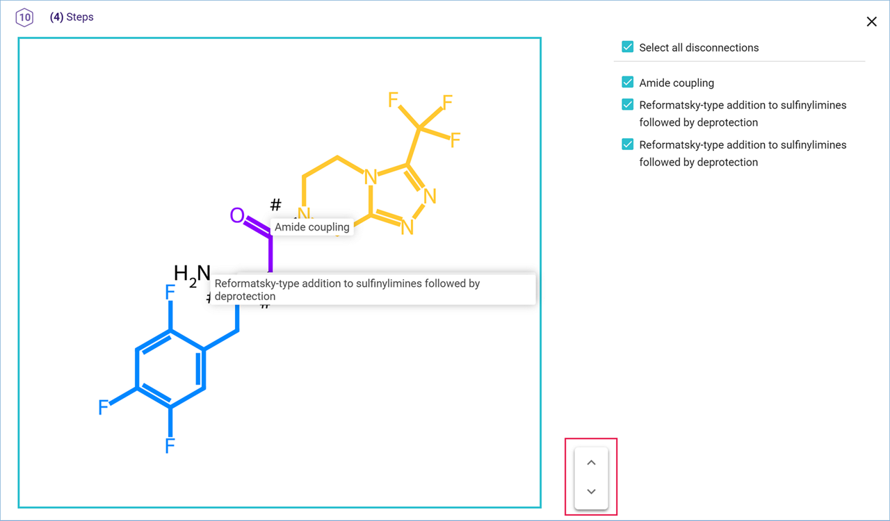 Click the target molecule to open the disconnection card for the corresponding pathway, and see which reaction is used to form each of the disconnected bonds. Hover over a disconnected bond to see the reaction name. Alternatively, you can select a reaction name from the list on the right to have it displayed next the corresponding bond disconnection.