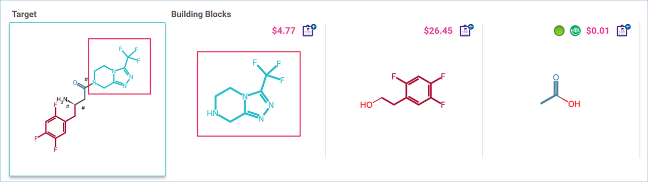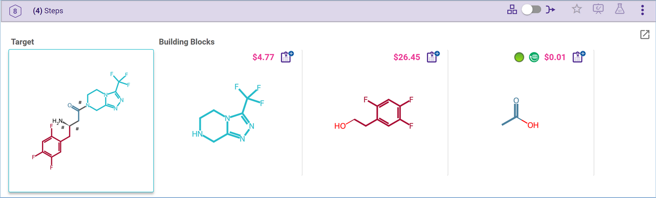 When a starting material is commercially available, the price per gram is displayed on top of the structure. Price per gram is based on buying research quantities and calculated as the median of the pricing for all catalogue entries.