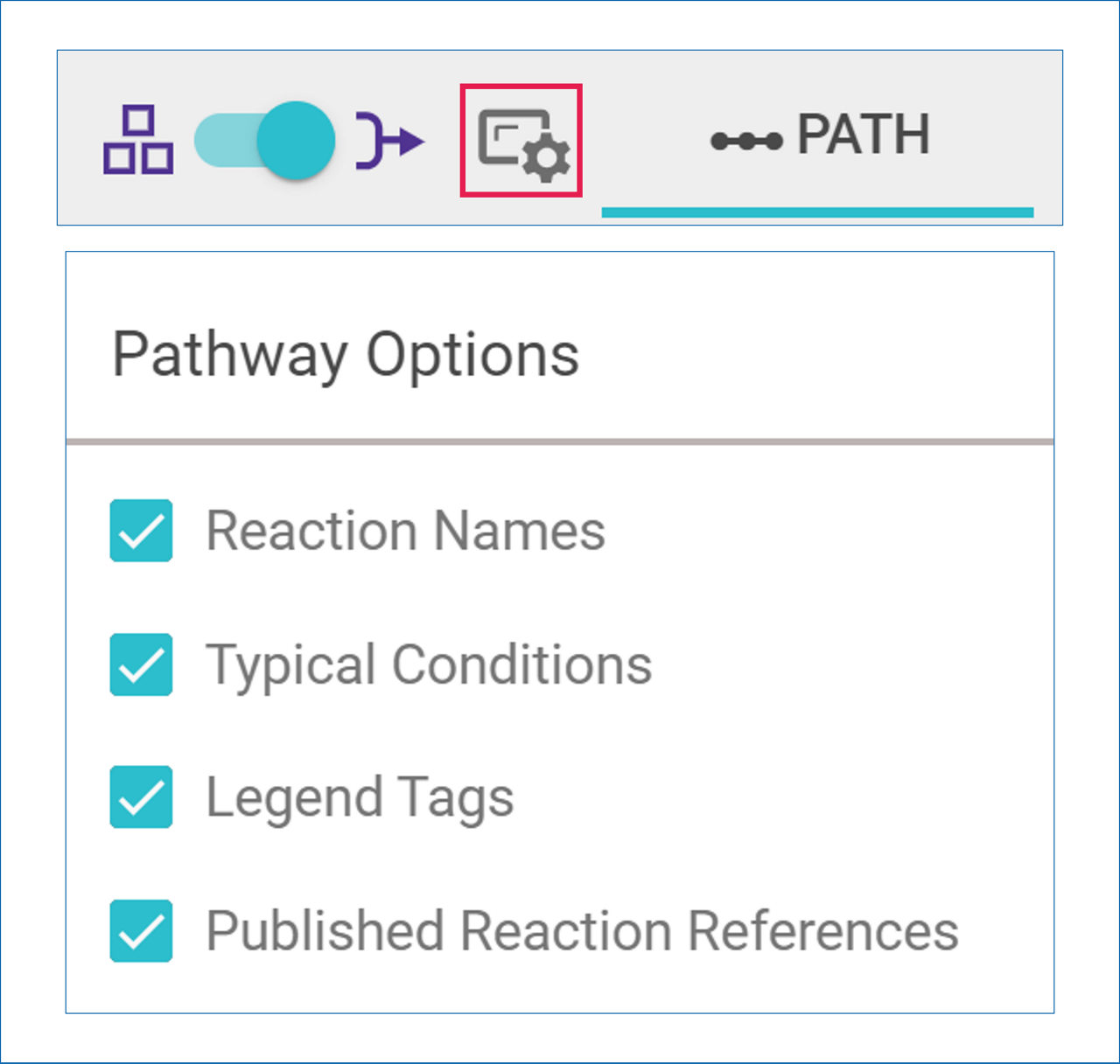 Click on the Pathway Options icon to open a menu that allows you to select how much information you want to see displayed in your Pathway View or Expanded Pathway View. All the options are enabled by default.