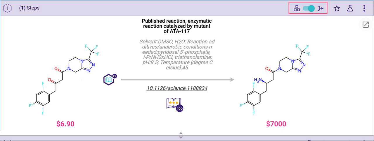 Pathway View is the second option to view the list of result pathways under the Path tab. In this view, full reaction schemes are displayed for each pathway. Pathway View can be enabled by clicking on the toggle above each pathway. Alternatively, clicking on the toggle in the white header on top of the pathway list will activate it for all pathways.