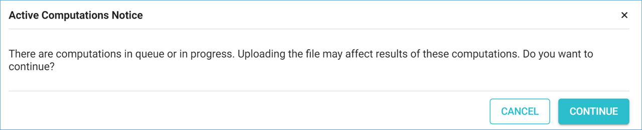 If an analysis is running when you click ‘LOAD INVENTORY’, a warning message will appear, and you may choose to abort the upload process by clicking ‘CANCEL’.