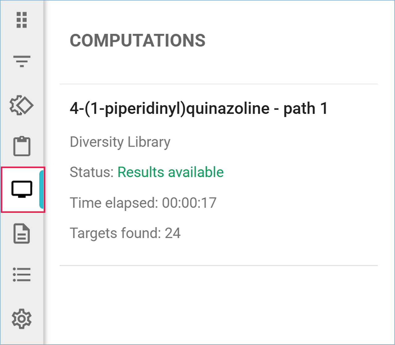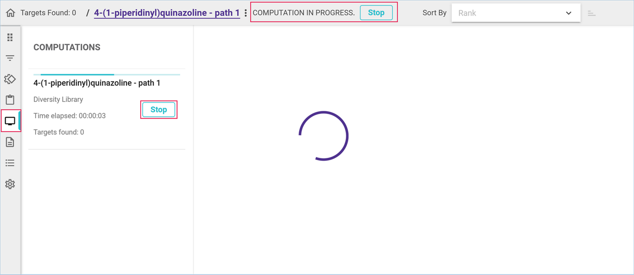 You can monitor the progression of the analysis in the Computations panel on the left side. Click on the 'Computations' icon to open the panel, where you can view the time elapsed, and the number of target molecules found.