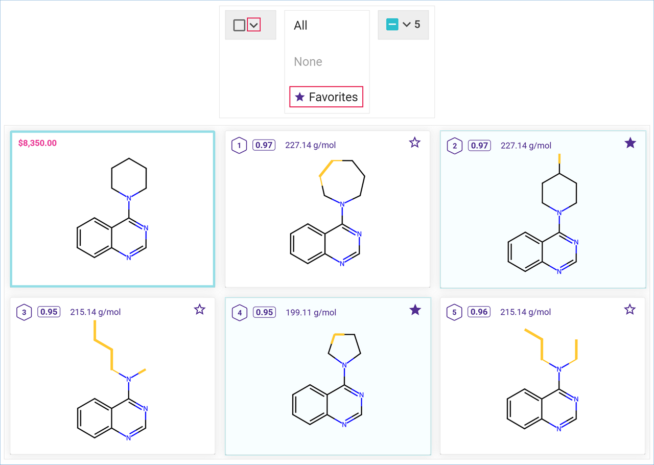 You can also apply the Molecule Actions to multiple molecules at once. Click on the selection checkbox to select or deselect all the target molecules. Click on the arrow next to it to open the Selection menu, where you can choose to select all target molecules, none, or only Favorites. Selected tiles will be highlighted in blue in the list.