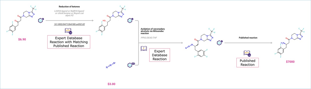 The book tag under reaction arrows indicates that published reactions similar to the suggested reaction in the pathway have been found. The number of stars in the book specify how closely similar the published reactions are to the suggested reaction.