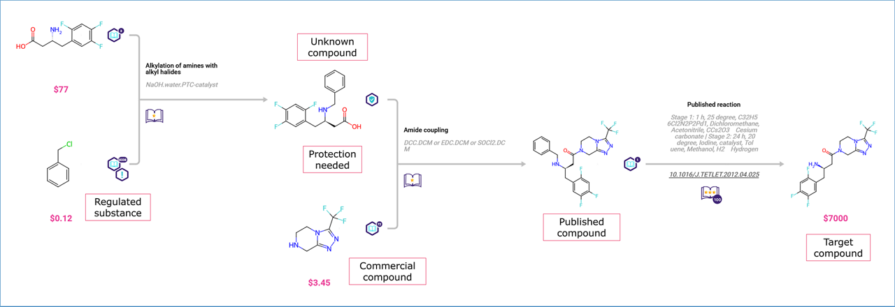 Compounds displaying a Shield tag require the protection of at least one of their functional groups for the suggested reaction to proceed. Click on the molecule to open the Molecule Card and find more information on the protection requirements.