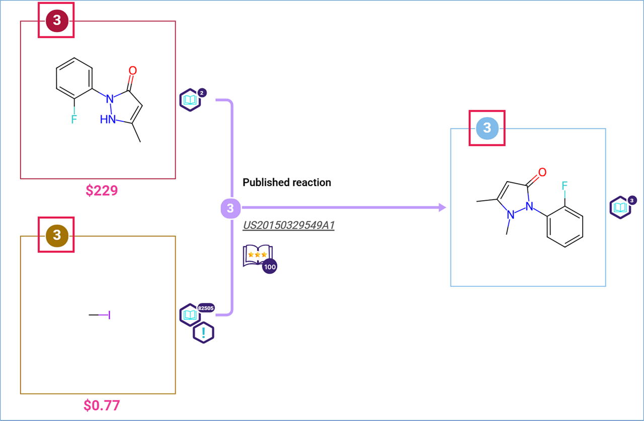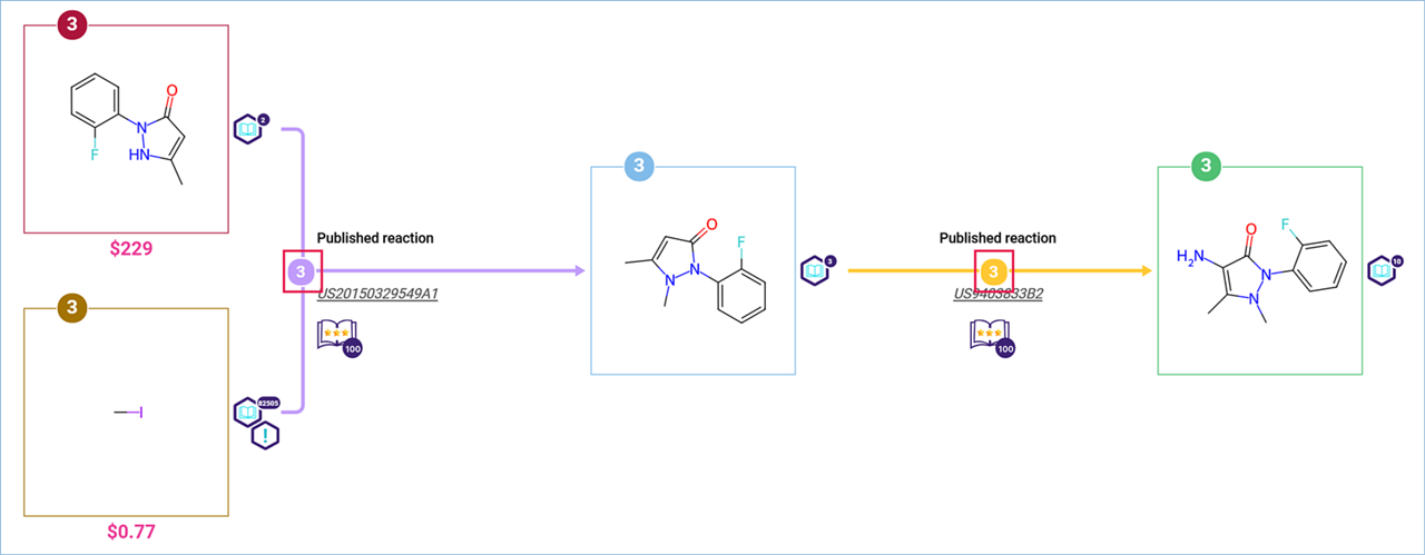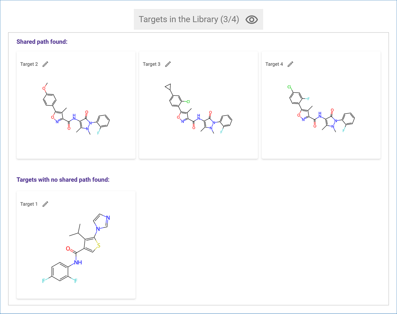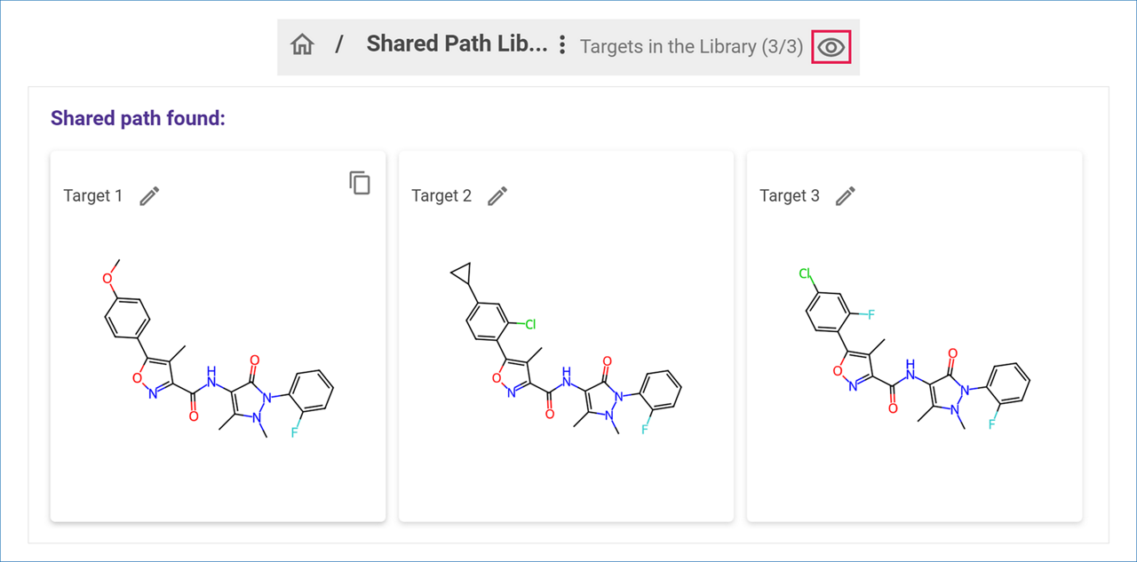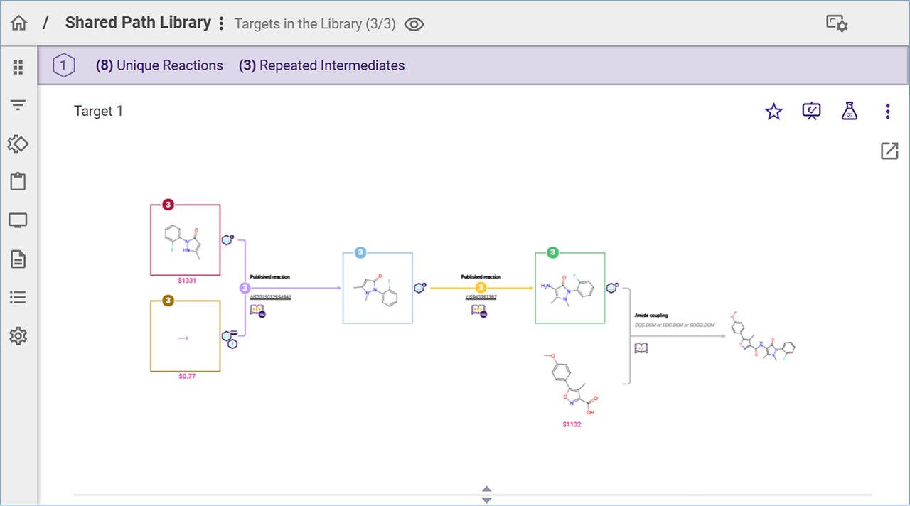 For Shared Path Libraries, SYNTHIA™ provides three sets of pathways for each library. Each set includes one pathway for each target molecule and highlights the shared intermediates and reactions among the pathways within that set.