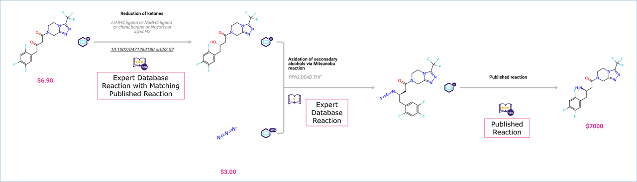 The book tag located under the reaction arrows indicates that published reactions similar to the suggested reaction in the pathway have been identified. The number of stars in the book signifies the degree of similarity between the published reactions and the suggested reaction.