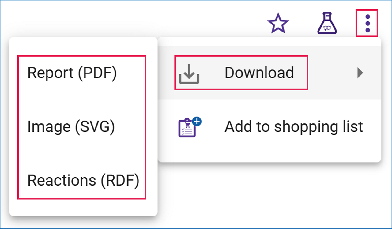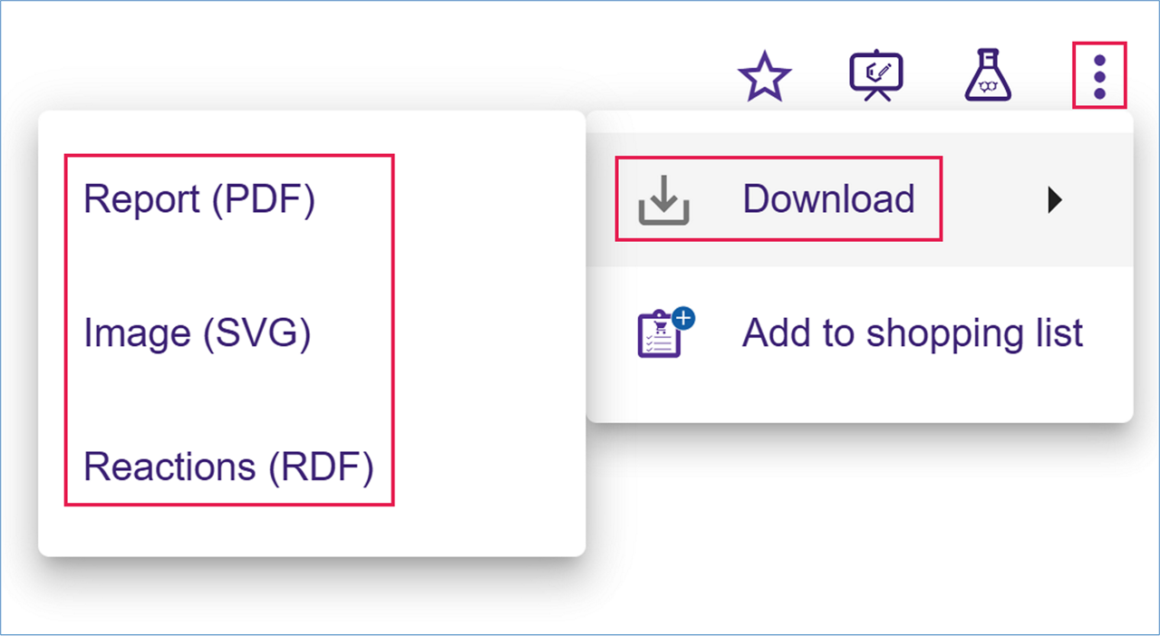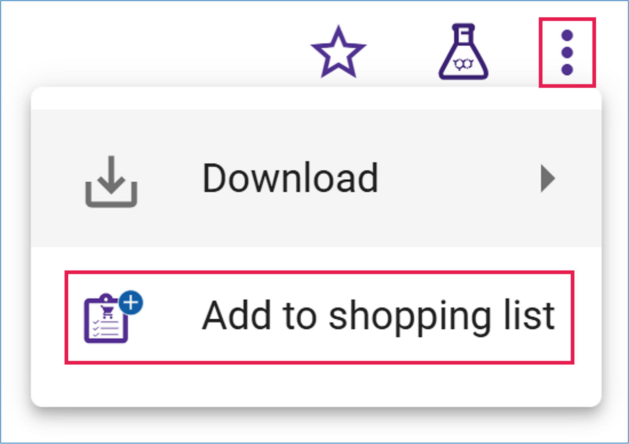 Open the three-dot menu and select ‘Add to shopping List’ to add the commercial compounds in the pathway to your shopping list.