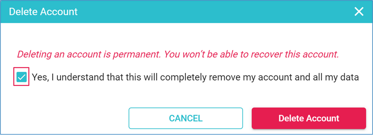 Click on ‘Delete Account’, check the box stating that you understand that the deletion of your data will be complete and irreversible, and confirm the deletion by clicking on the red ‘Delete Account’ button.