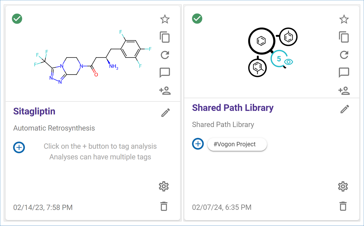 Each analysis card displays a series of icon on its right side. Hover over any icon to see a description. Starting from the upper right, and going downward, an explanation of each analysis action is described below.