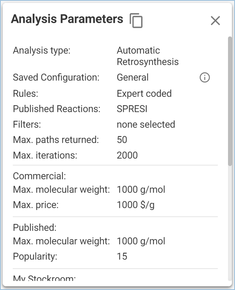 Click the ‘Analysis Parameters’ icon to see the settings selected for the analysis. Click the ‘Copy’ icon to copy the parameters to your computer’s clipboard.