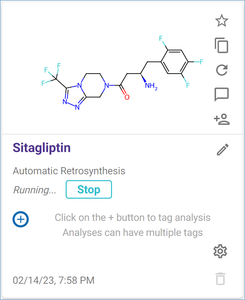 The maximum limit of automatic retrosynthesis analyses or batch analyses that can run concurrently has been reached. Your analysis has been added to a queue and will run as soon as a spot is available. Click ‘STOP’ to end a queued analysis before it starts.