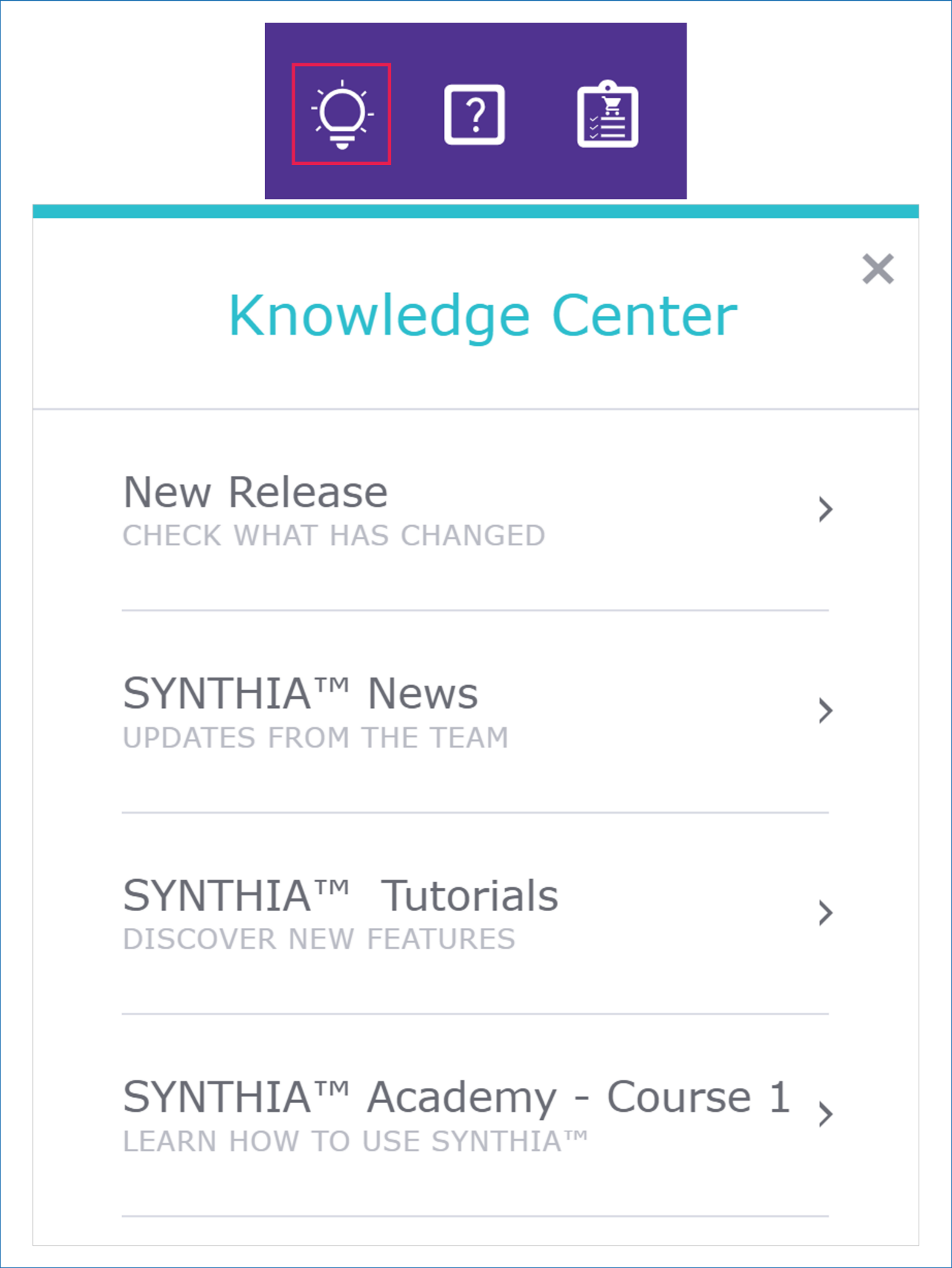 The knowledge Center provides news about releases, as well as in-application tutorials to get you started with SYNTHIA™ and introduce new features. Click on the Bulb icon to access it and select the desired section.