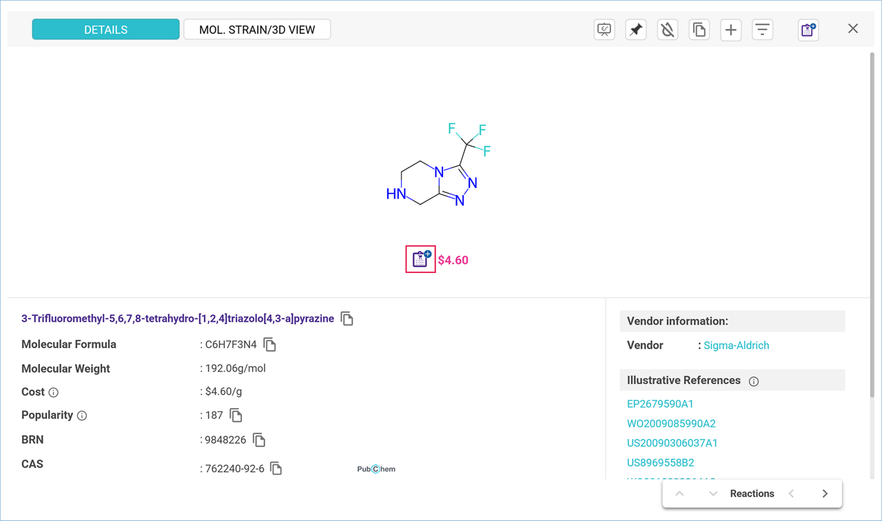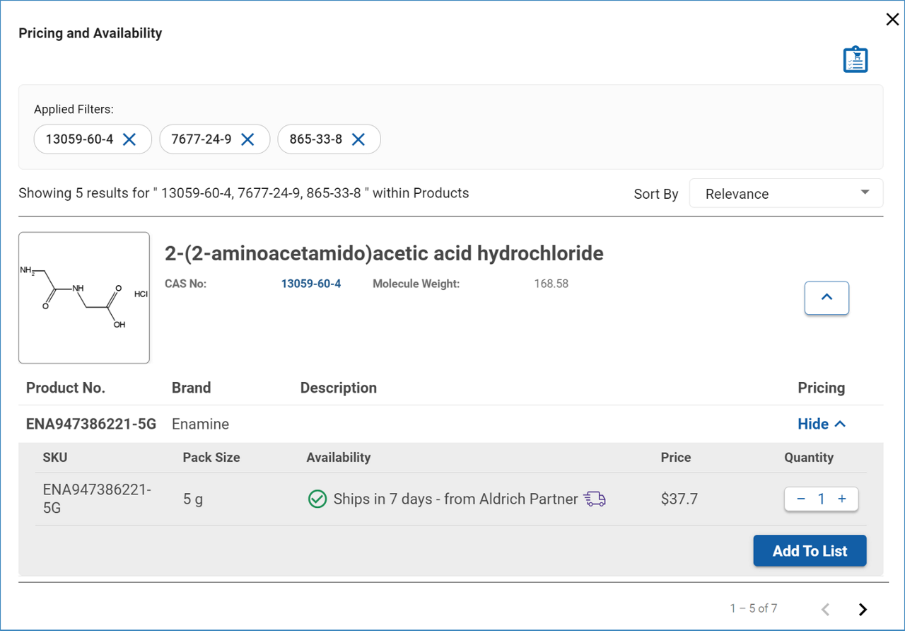 The offerings are called directly from the Sigma Aldrich catalog, so availability is up to date and prices reflect any discount negotiated with your organization. Select the grade and quantity you need and click ‘Add to List’ to add your compound to the Shopping List.