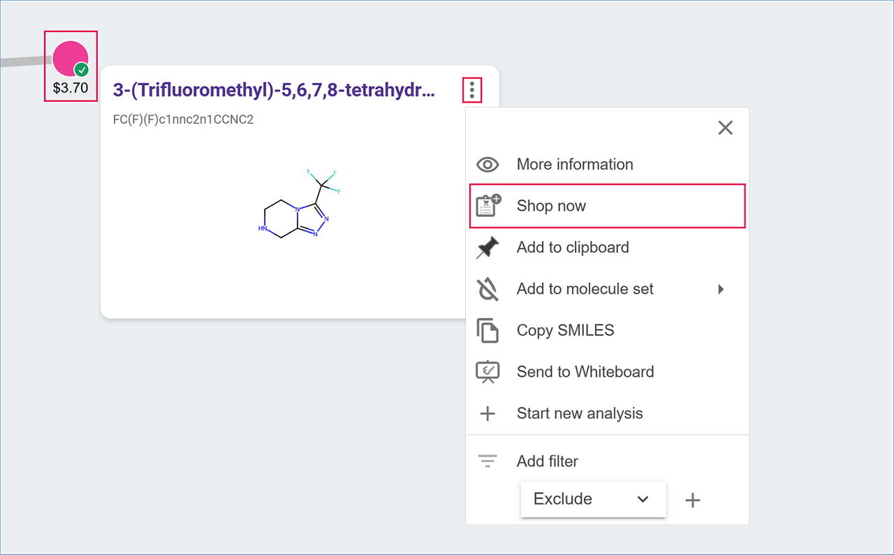Hover over or click on a commercial compound node (pink dot) to open a popup with its name and structure. Click on the ‘three-dot menu’ icon to access more options and select ‘Shop now’ to see catalog availability for the selected compound.