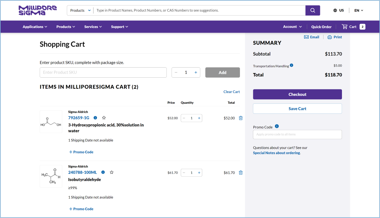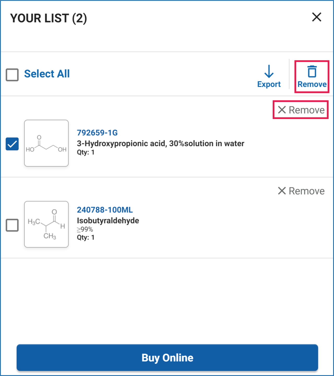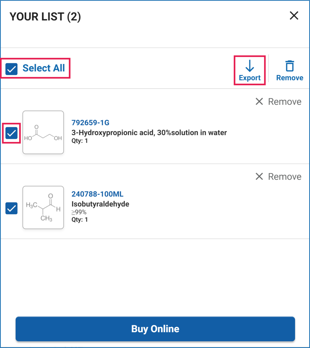 Once you are ready to place an order you may click on the ‘Buy Online’ button. A new tab will open to access your shopping cart in your Sigma Aldrich e-commerce account. Follow your usual checkout process to complete the order.
