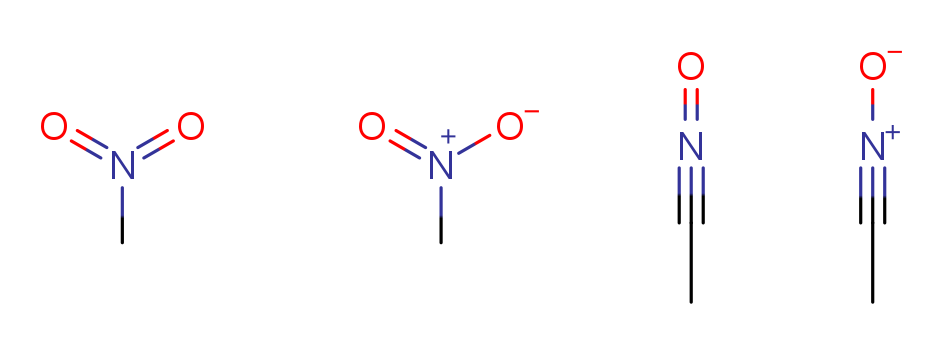 - Nitro, N-oxides, isocyanates or similar functional groups with multiple resonance forms may be depicted in any of the following forms