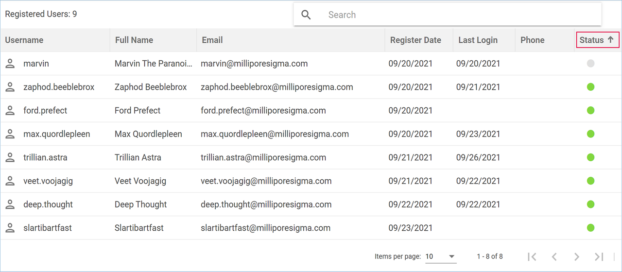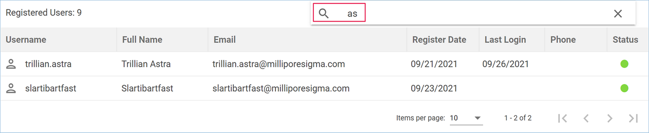 The User Management page contains a table with all the registered users of your organization. The username, full name, email address, and phone number (if submitted) are listed for each user, as well as their registration date, and the date they last logged into the application. Active users are indicated with a green dot in the status column, whereas a grey dot is displayed for inactive users.