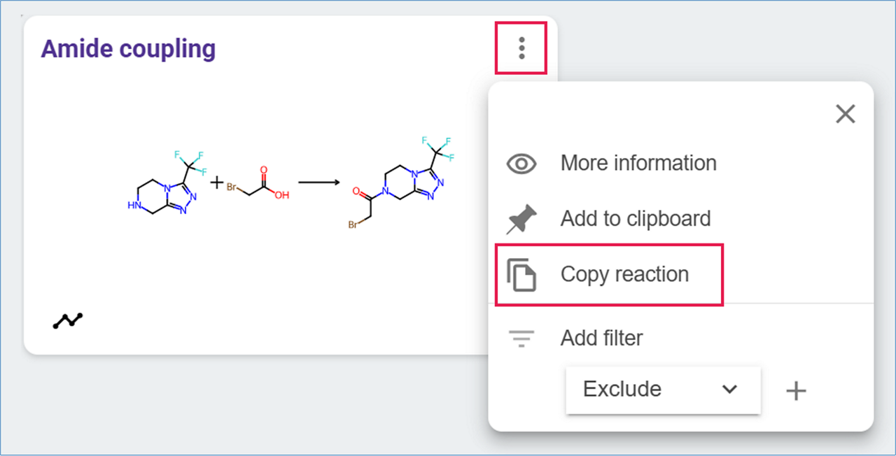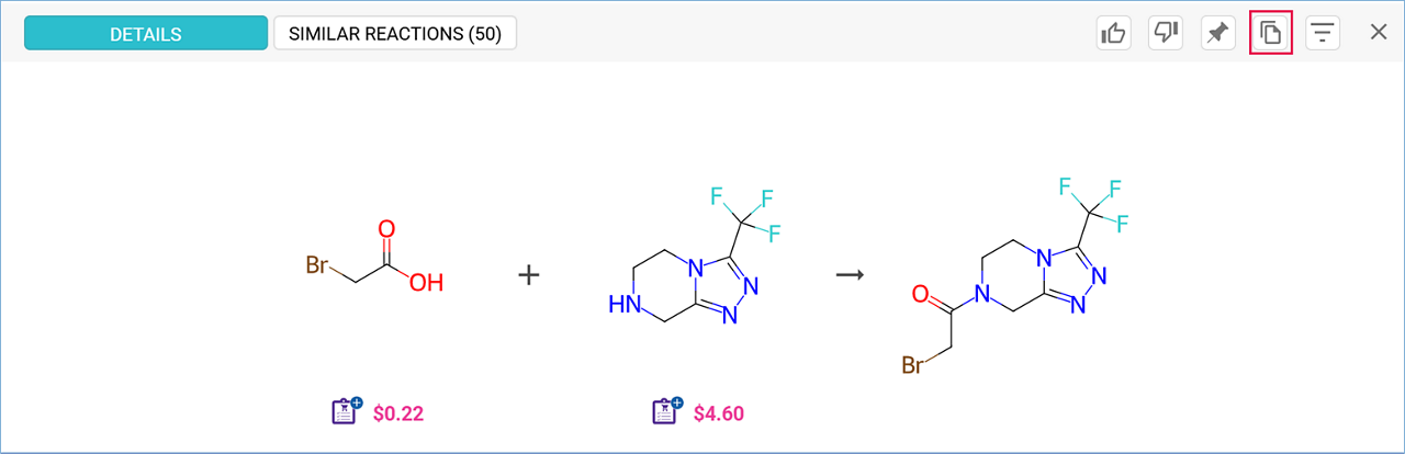 In Pathway View, click on the desired reaction name to open the reaction card and select Copy Reaction.