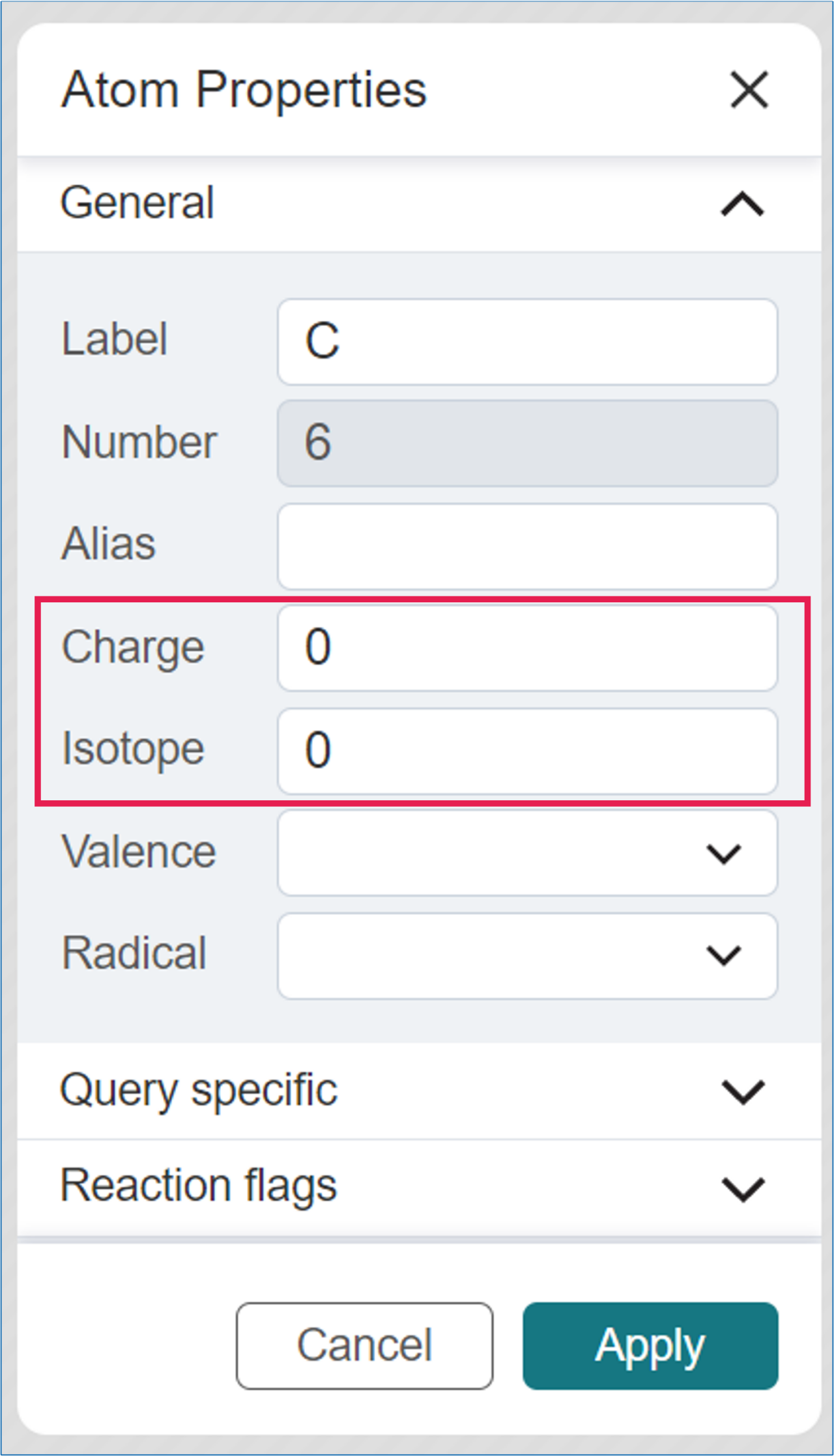 When the Selection Tool is active, double-click on any atom to open the Atom Properties Menu.