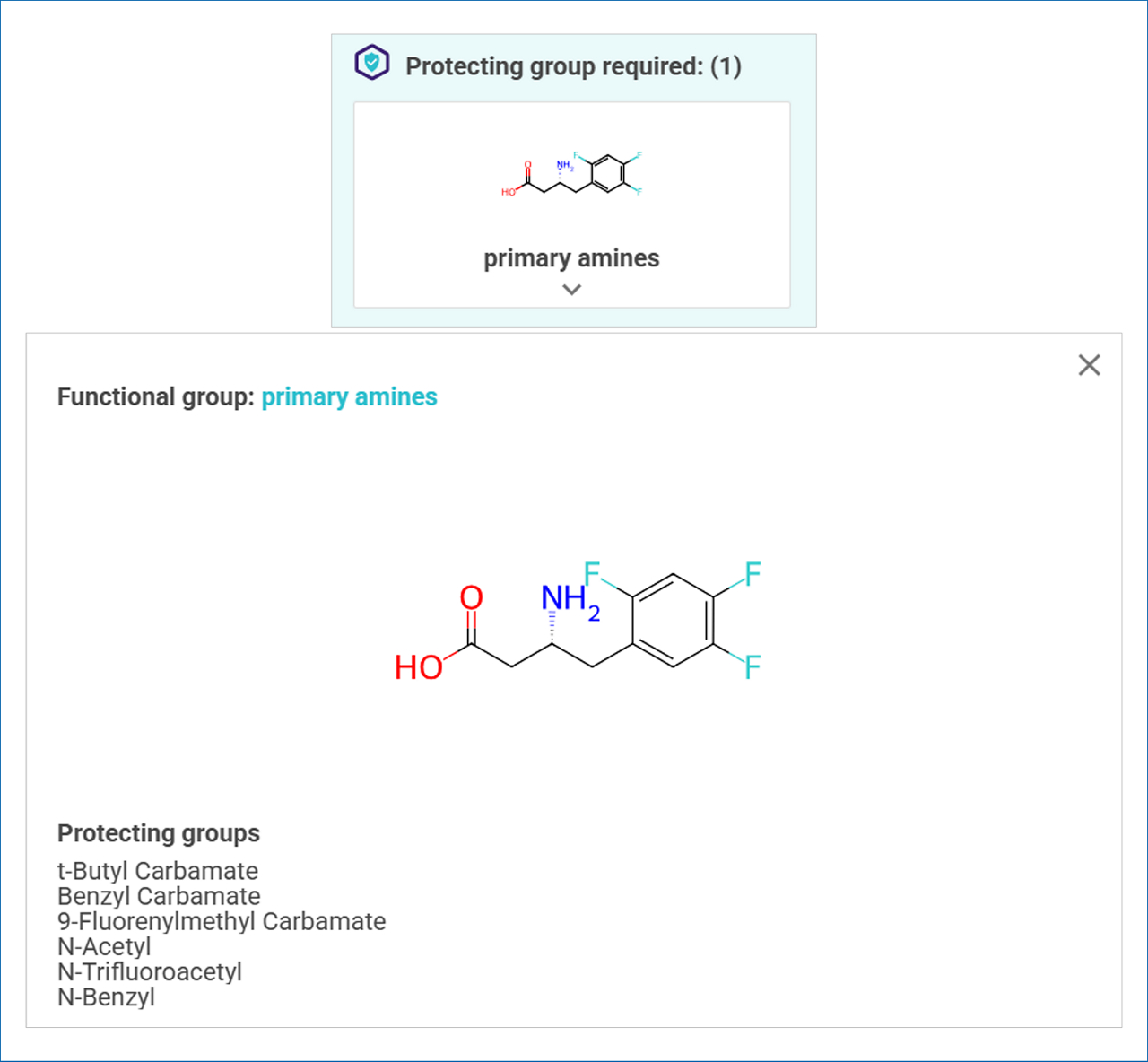 Click on the Shield tag to open the Molecule Card. At the bottom of the card, you will find detailed information about the required protecting groups: