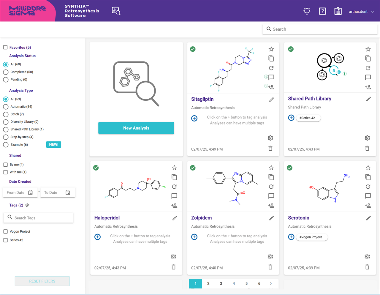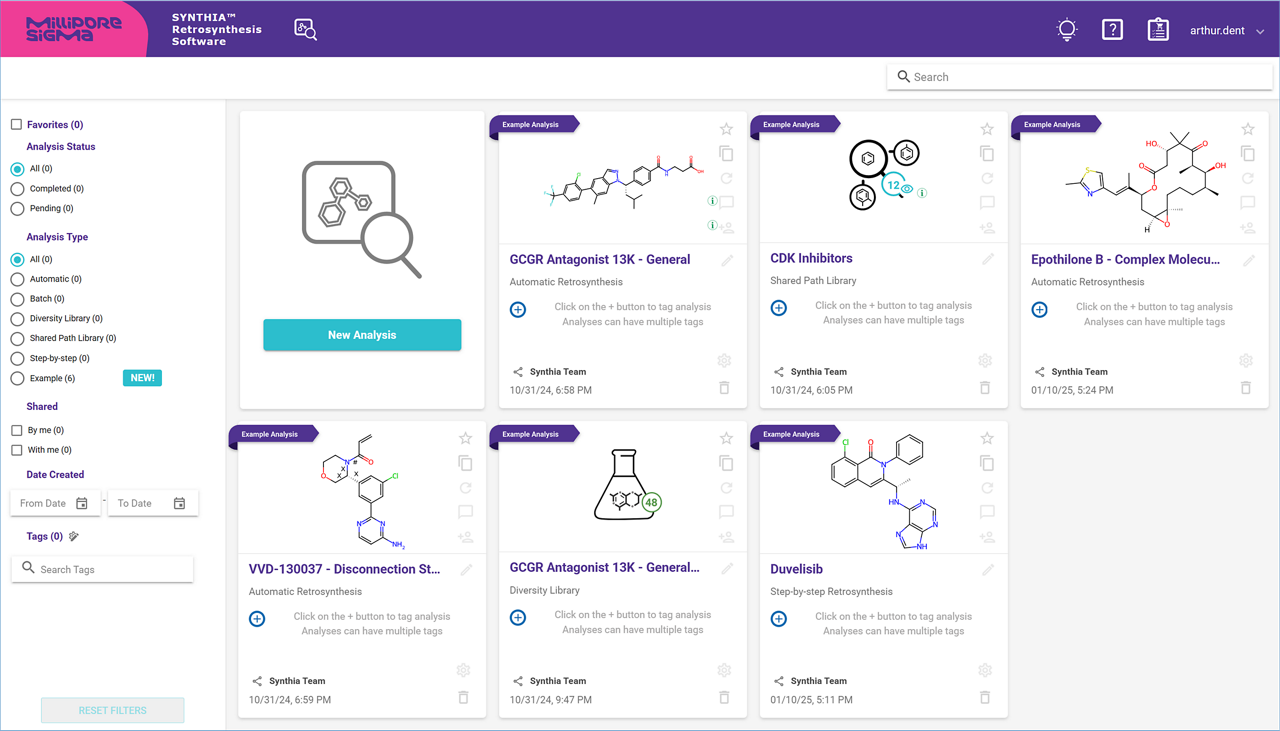 All your analyses are stored on your dedicated SYNTHIA™ Retrosynthesis Software web server and can be accessed through a dashboard on the application homepage. Upon logging into your account for the first time, you will see several pre-run analyses that serve as examples of the different types of analyses available in SYNTHIA™.