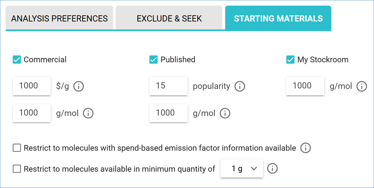 When setting up an analysis, inventory compounds can be customized as starting materials in the ‘Starting Materials’ tab.