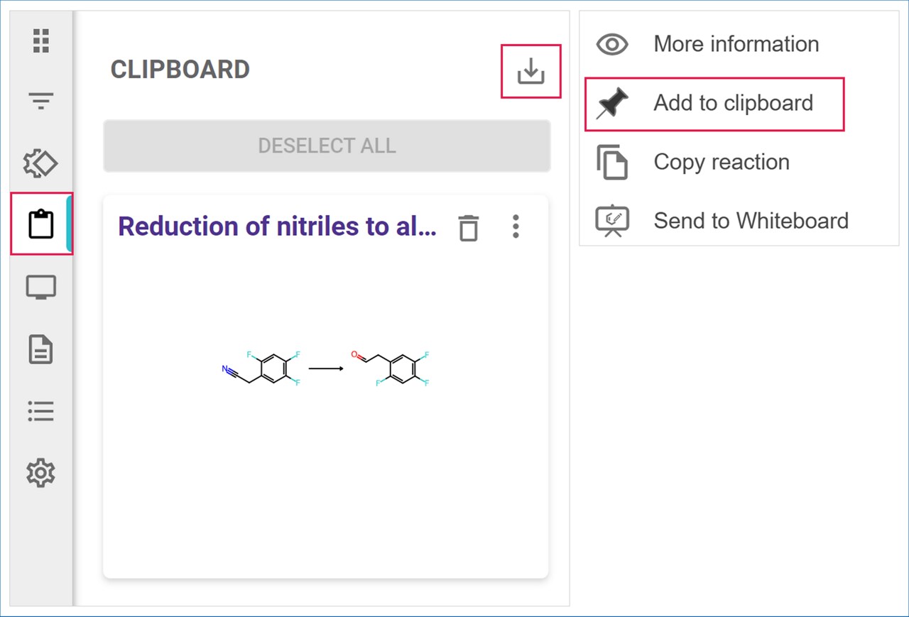 Click the ‘Download’ icon to export your list of reactions and molecules from the clipboard to a csv file.