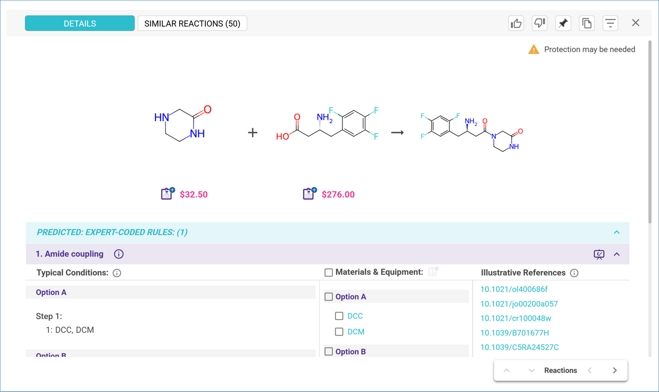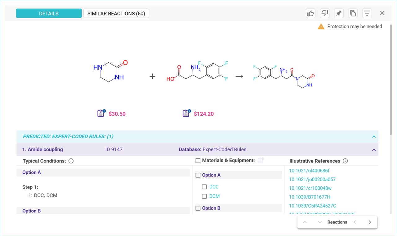 Reaction Cards provide detailed information about any reaction suggested by expert-coded rules, machine-learning rules or published reactions.