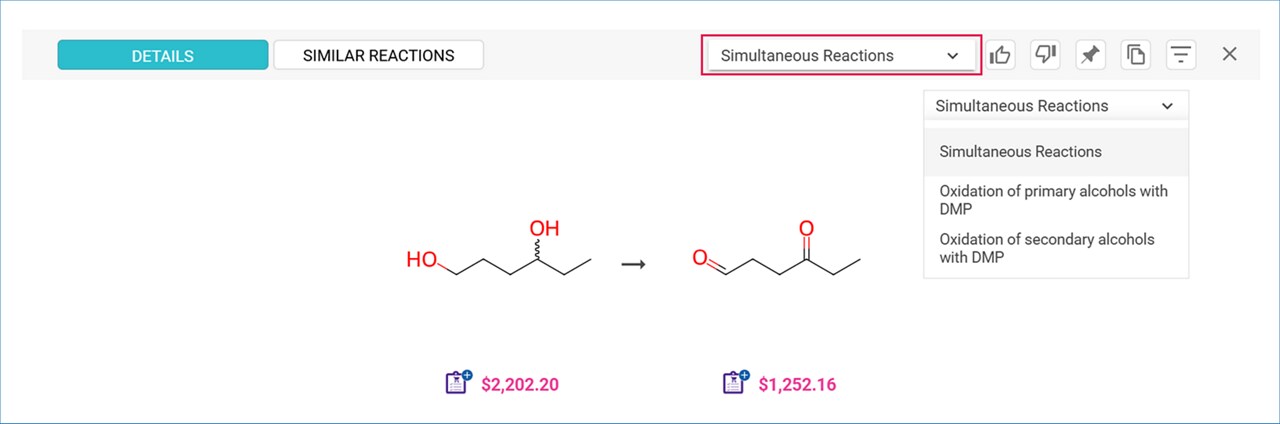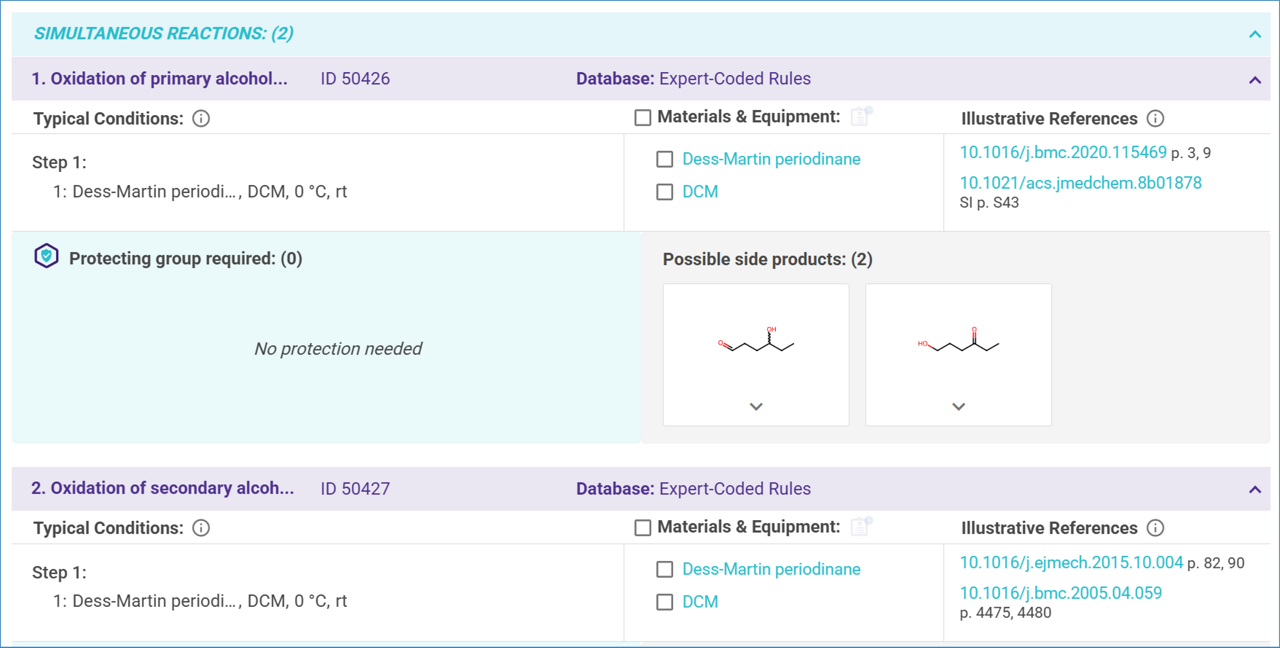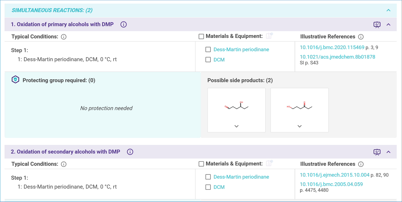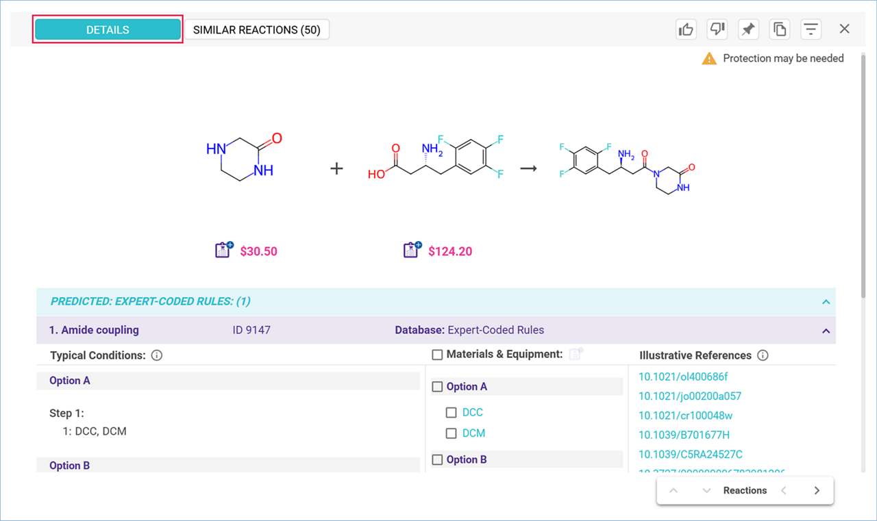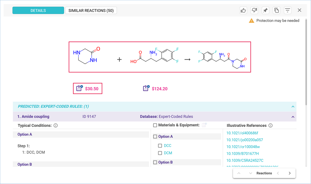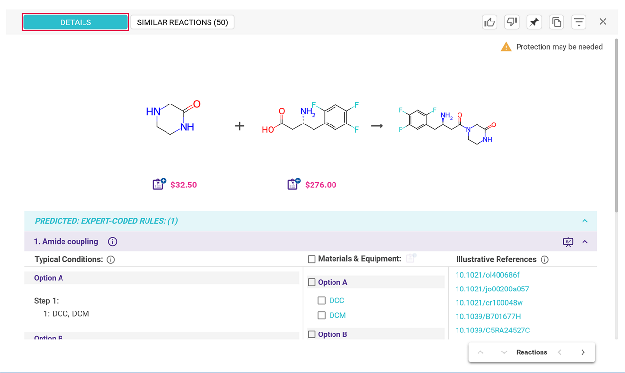 If a reaction has protection requirements, lacks selectivity, or is only diastereoselective, a warning icon will appear in the upper right corner of the reaction scheme, along with a corresponding indication.