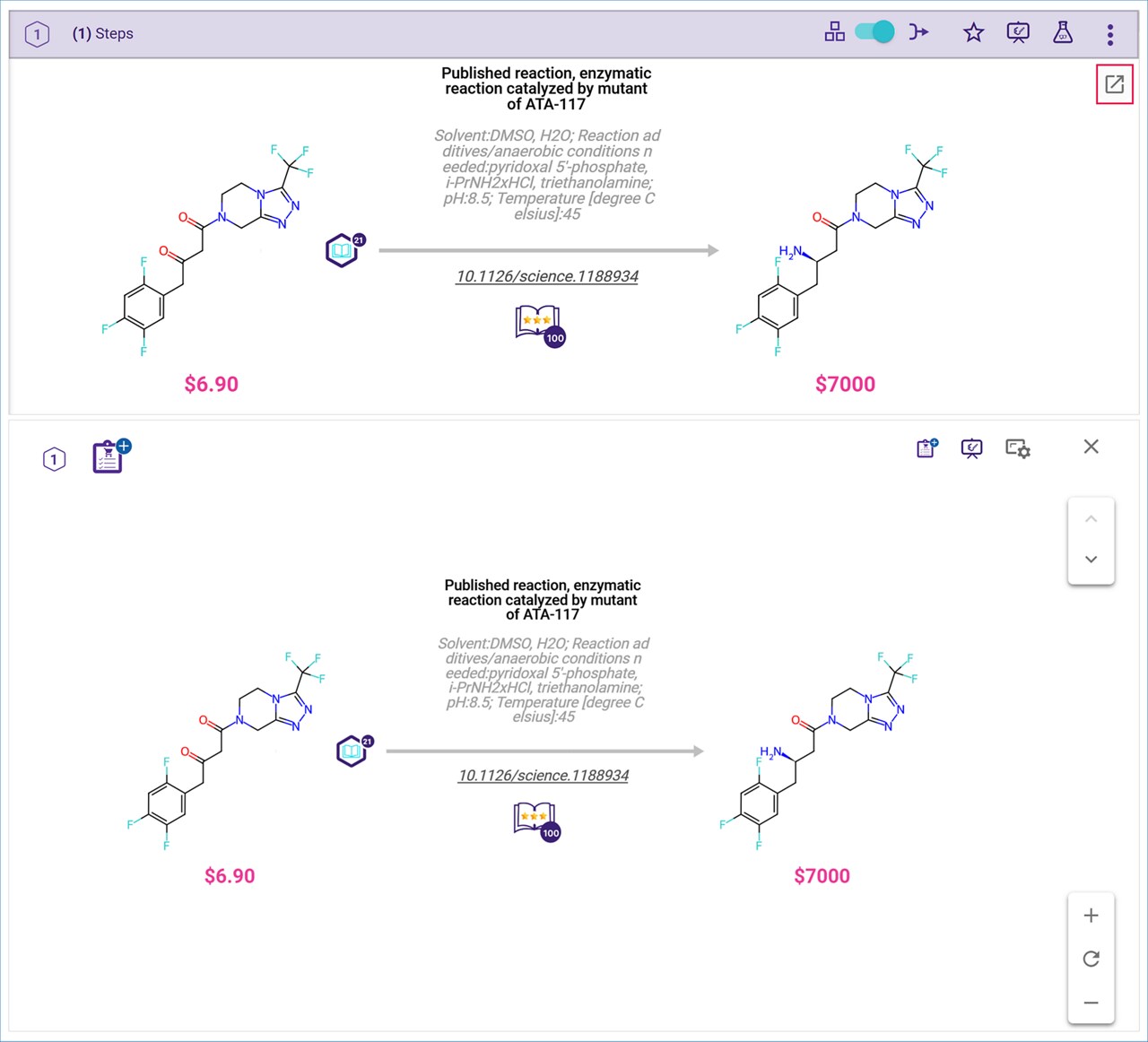 The ‘Shop Now’ icon allows you to add the commercial compounds in the pathway to your Shopping List. For instructions on setting up and using your Shopping List to select the commercial compounds you wish to purchase, please refer to the “Shopping List” section in the Analyses Dashboard User Guide.