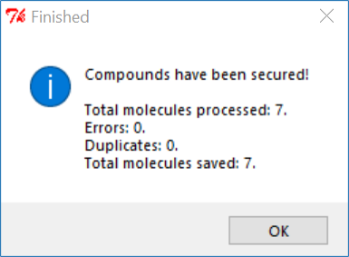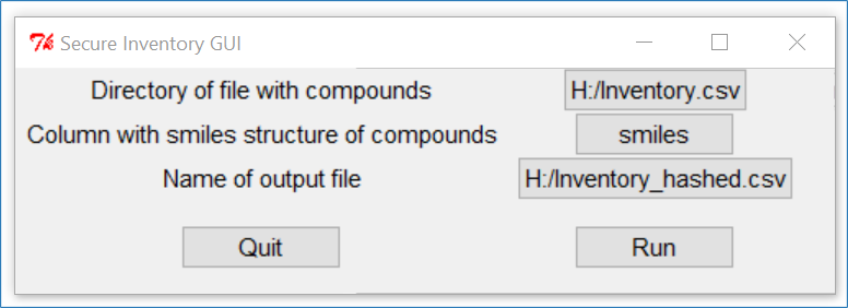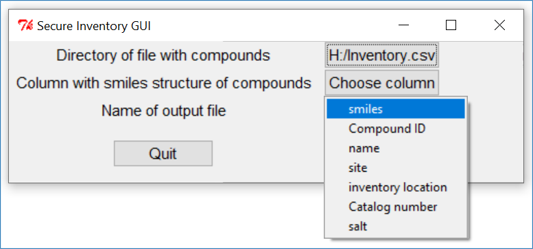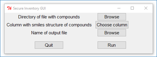 The inventory must be formatted as a CSV or SD file prior to encryption. Please make sure that the file contains only one entry per structure, either in MOL form (SD file) or in SMILES strings (CSV file), as only one field can be selected for hashing. If there is structural information or proprietary information in any other column, the data will be left as is in the resulting CSV file and imported in SYNTHIA™ during the uploading process.