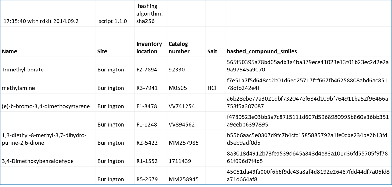 To ensure that no sensitive information is sent to our server, we use a cryptographic hash function to convert structures before they are uploaded. The hashing algorithm is a one-way function, which cannot be inverted. We recommend hashing structures of inventory compounds at the user’s location using an encryption tool, which can be downloaded from the SYNTHIA™ application.