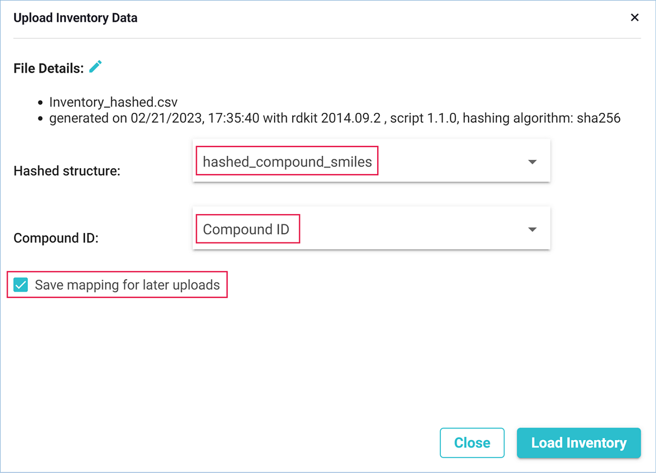 - In the drop-down menus, match ‘Hashed structure’ with the ‘hashed_compound_smiles’ field from your file, and ‘Compound ID’ with a compound identification field of your choice; you can save this mapping for future uploads