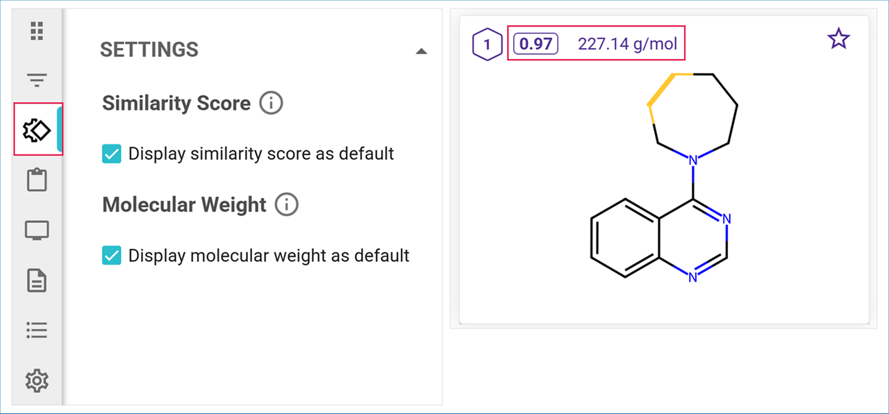 In the Settings panel, you can enable or disable the display of the similarity score and molecular weight for the library target molecules.